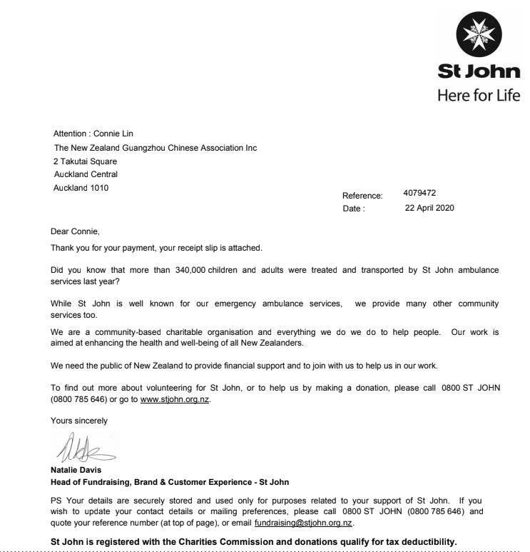 新西兰广州同乡会 在Covid-19疫情期间 向 St John 救护车机构捐款
